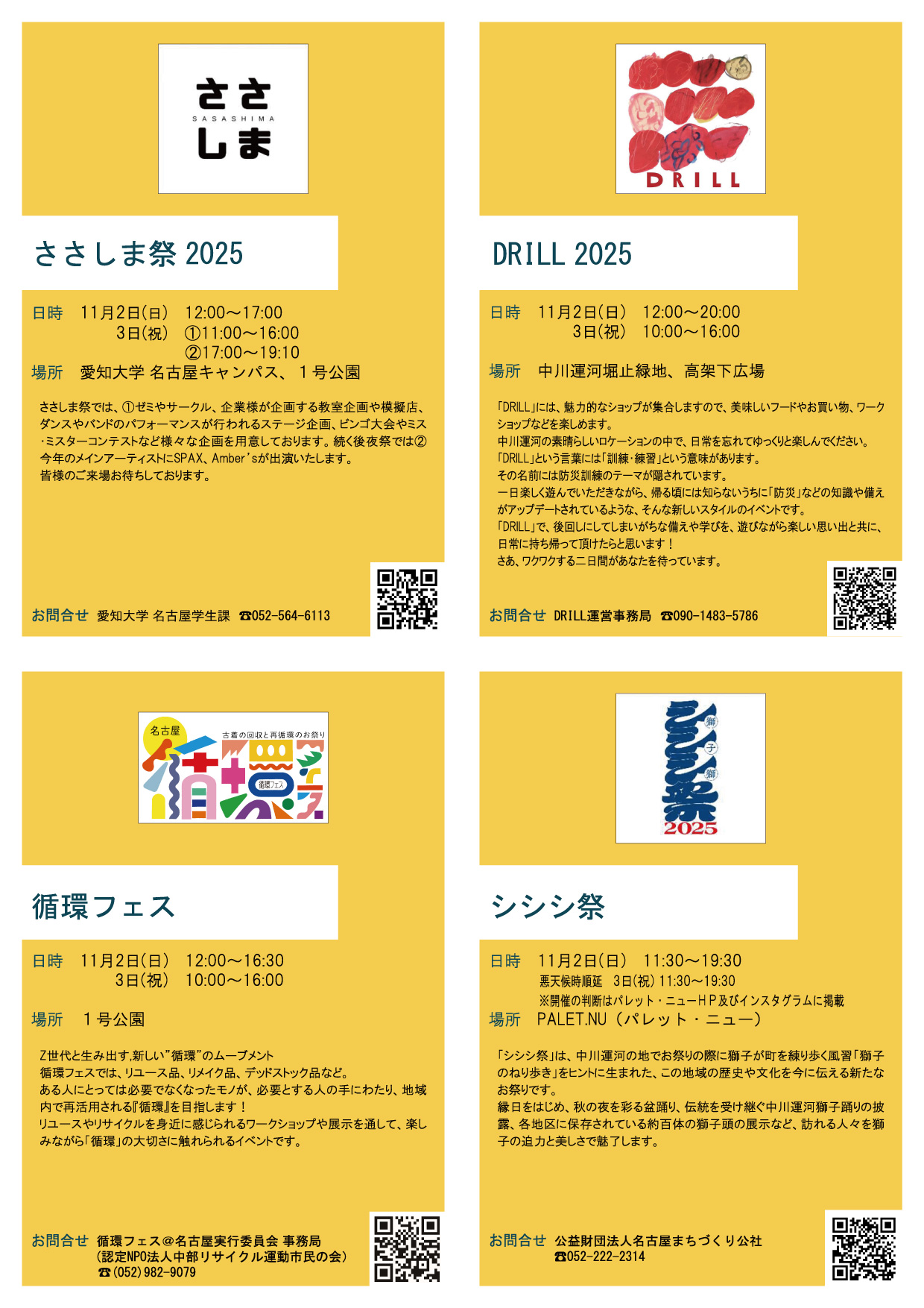 愛知大学による『ささしま祭』、『循環フェス』、『DRILL2025』、『シシシ祭』と