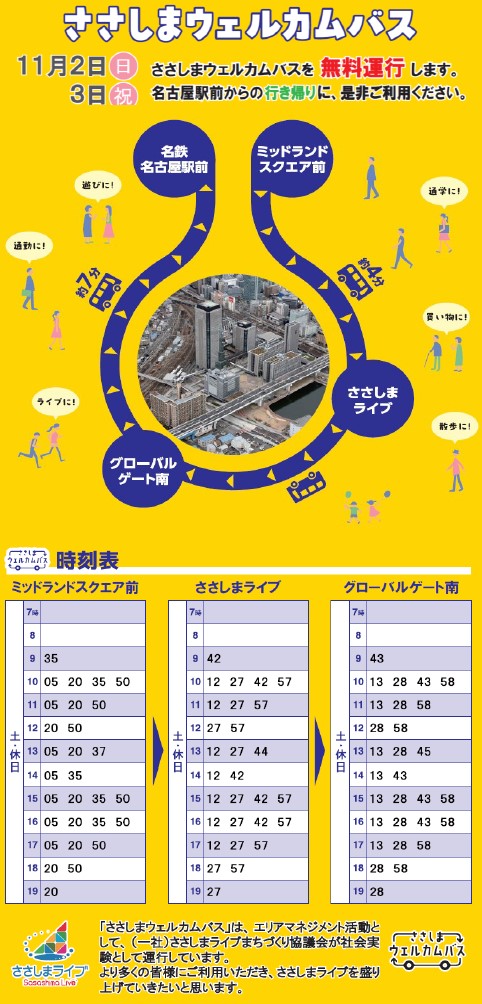 この両日は、名古屋駅~ささしまライブ間で運行する『ささしまウェルカムバス』が